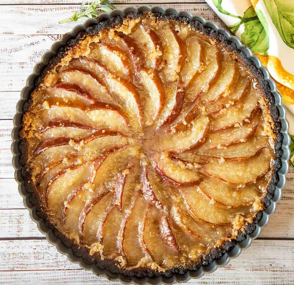 4. Assemble your tart. Starting on the outside, arrange the pear slices in concentric circles over the pastry. Sprinkle the crumb topping evenly over the fruit.