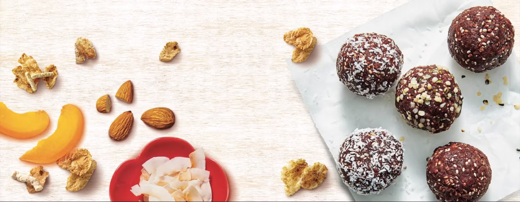 Soak the chopped apricots in boiling water for 5 minutes. Place in food processor along with cacao, your favourite Uncle Tobys Plus cereal, chia seeds and almond butter.